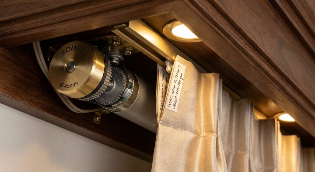 Somfy and Lutron manufacture motors in standard diameters (35mm, 45mm, 58mm) that fit within typical curtain rod cavities. These tubular motors operate on 24V DC or 120V AC, drawing 45W to 85W during movement and under 2W in standby. Soft-start acceleration prevents fabric jerking, with ramp-up periods of 0.8 to 1.5 seconds to full speed.